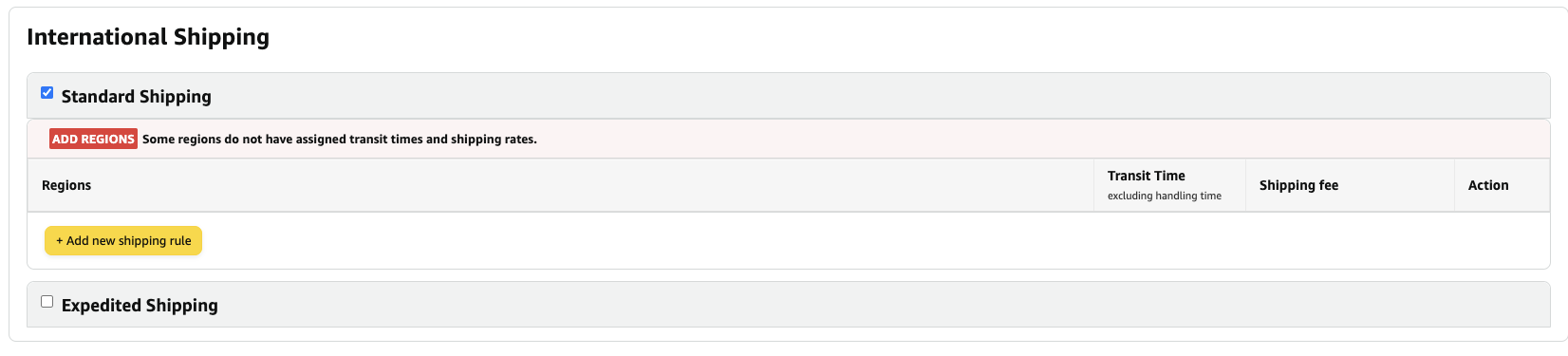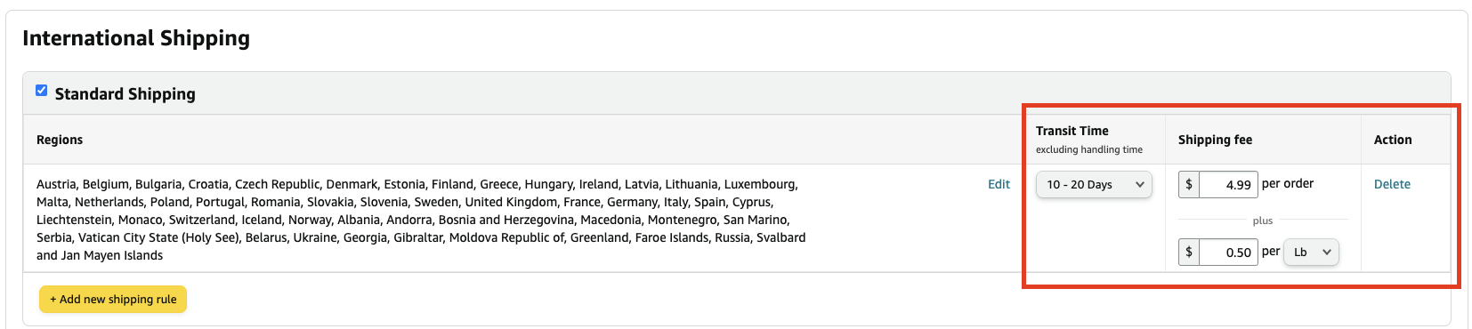 4. 選擇“international standard shipping”(國際標準運輸)并添加新的運輸規則